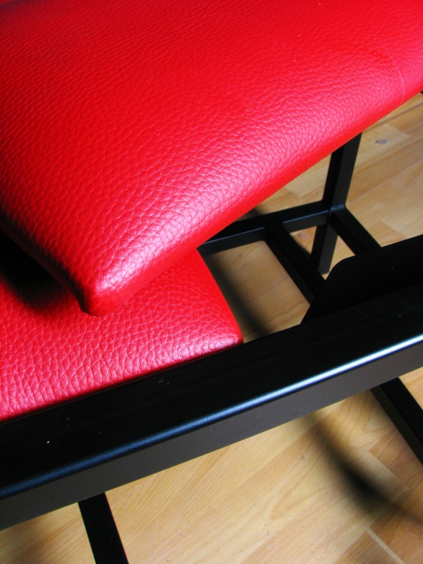 Schwarz lackiert, Sitzfläche mit schwarzen oder rotem Kunstleder bezogen, leicht gepolstert. Andere Farben sind natürlich machbar.