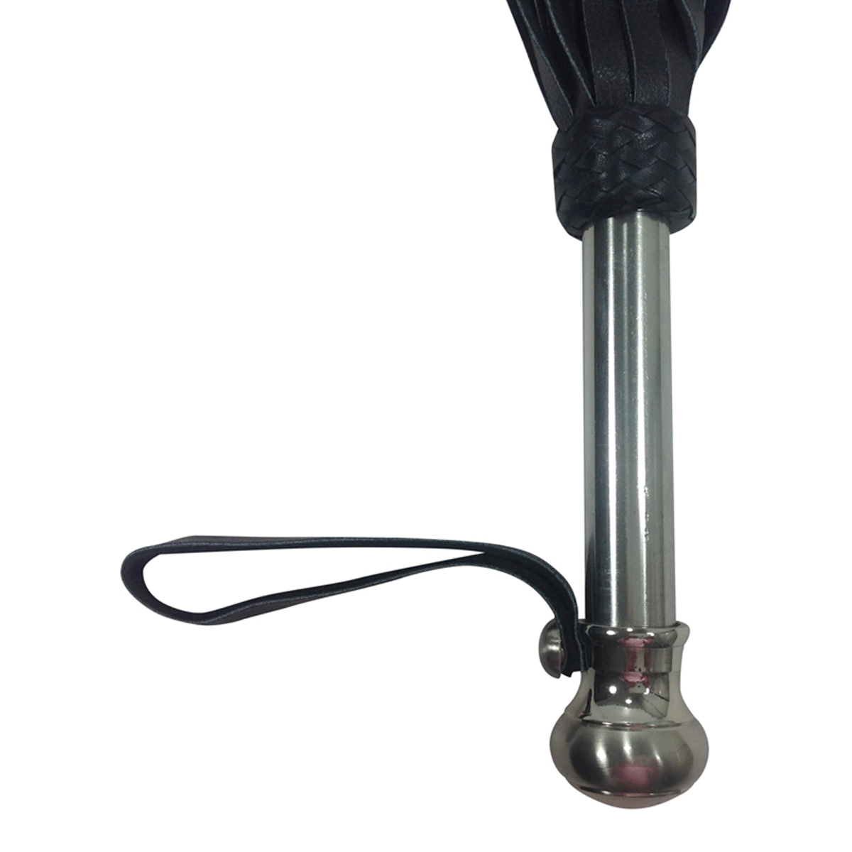 Peitsche mit breiten Lederstriemen und Griff aus Edelstahl mit Halteschlaufe.