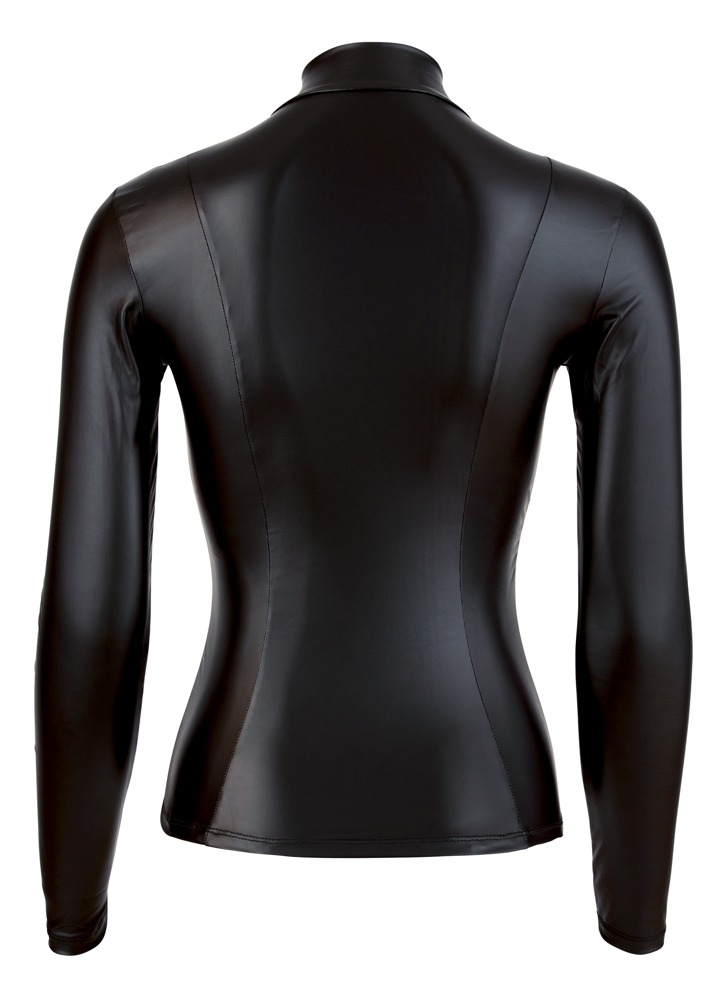 Wer steht nicht auf heiße Kurven?! Dieses schwarze Top betont die besten Argumente ganz hervorragend - ohne vorab zu viel zu verraten. Hochgeschlossen mit kleinem Stehkragen und langen Armen kommt das mattglänzende Top daher, doch dank des hautengen und taillierten Schnitts ist es alles andere als langweilig.